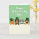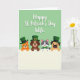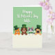 Designed with a soft green background, this St. Patrick’s Day card features a friendly group of four cartoon-style animals peeking over a light cream horizontal band, their little paws resting on the edge as if leaning in close. Across the upper area, the message “Happy St. Patrick’s Day Wife” appears in white lettering, centered and easy to spot against the green field 💚. The characters include an orange cat, a brown dog, a gray-and-white cat, and a small light-brown dog with a pug-like face, all drawn with big eyes and smiling mouths that feel inviting and affectionate. Three of them wear green top hats, and one hat includes a small golden buckle, adding a festive touch ☘️. The gray-and-white cat stands out with a green bow tie, giving the group a slightly dressed-up look that fits a sweet, close-knit bond. Warm animal tones balance the green background, creating a cozy scene that reads like a cheerful inside joke between partners or close friends. The cream band sits across the lower portion of the design, with the animals lined up shoulder-to-shoulder above it in a neat row. The orange cat and brown dog sit near the center, their hats tilted slightly forward as they peek over the cream border.