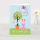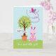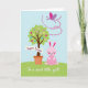 This card shows a spring scene with a potted tree topped by a wide green canopy, sprinkled with star-shaped ornaments in pink, purple, yellow, and blue 🌷. Beside the pot sits a soft pink bunny-like character with long ears, rosy cheeks, and a small smile, angled toward the tree as if keeping it company 🐰. The bunny’s relaxed pose and gentle face add a quiet, friendly closeness to the scene. Above them, a butterfly-like figure with fuchsia and lavender wings glides across a light blue sky, trailing a curved line of small pink beads that suggests motion. The ground is a bright lime-green field that makes the pastel colors stand out. A ribbon banner wraps across the tree trunk with a short Easter greeting in a light color, while a second line of text runs along the bottom edge in a matching shade. The butterfly’s wings show tiny patterned details, and the stars are scattered across the canopy like little decorations.