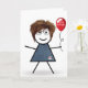 Garota com balão vermelho, vestido de denim, cabelo e óculos em fundo branco para aniversário Texto em balão pode ser editado ou excluído. A cor de fundo pode ser alterada.