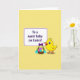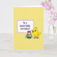 This card shows a sunny yellow little bird near the lower right, with big friendly eyes and a slightly open beak that feels like it’s chirping a sweet hello to someone special 🐰. Beside it sits a woven basket filled with decorated eggs in soft pastel pink, purple, blue, and yellow, including a few with gentle stripes that add a cozy, shared-celebration feel. A purple bow is tied to the basket, and short green grass with tiny blue flowers gathers around the base as if the bird is lingering there to keep a friend company 🌷. In the upper left, a rounded rectangular panel outlined in rich purple holds the greeting text, set neatly inside the frame for easy reading. The message is arranged in centered lines, standing out clearly against the light interior of the panel. A pale yellow background covers the whole scene, giving everything a warm spring glow without overpowering the details. The outlines are thick and simple, making the bird’s rounded shape and the eggs’ patterns easy to notice at a glance. The purple-framed text box sits above the basket, while the bird and eggs cluster together in the lower right against the pale yellow backdrop.