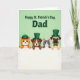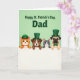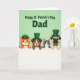 This card features a mint-green background with the greeting “Happy St. Patrick’s Day, Dad,” set near the top in dark emerald lettering, with a little extra spacing that lets the words breathe 💚. Below the message, two cats and two dogs lean over a wide white banner, their paws curled over the edge as if they’re sharing a secret together. On the left, an orange tabby cat wears a green patrol cap, its bright eyes angled toward the group like it’s in on the joke. Next to it, a brown-and-white dog smiles under a green top hat with a gold buckle, facing slightly toward the tabby in a friendly, close-at-hand pose ☘️. A grey-and-white cat with turquoise eyes adds a cool contrast, gazing forward while staying shoulder-to-shoulder with the dog. At the far right, a fawn pug tops off the lineup with a small green hat and an emerald bow tie, its soft expression turned toward the others. The white banner spans the lower portion of the design, crisp against the green field, with the four pets peeking over it in a neat row.