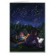 A arte Starry Night de Traci Van Wagoner impressão, posters, acessórios e presentes mostra nossa pintura original de duas crianças e seu grande e negro cão acampando sob as estrelas lendo um livro fantástico ao redor de um fogo no acampamento sobre cavaleiros e dragões. A magia da história está subindo no céu estrelado para mostrar um cavaleiro e um dragão numa dança eterna noturna de estrelas. Aproveite um acampamento noturno de verão nas montanhas.