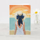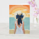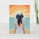 Esta papelaria mostra um retrato de uma mulher vestindo um chapéu de sol enorme olhando para o pôr do sol sobre a praia.