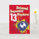 O cartão de aniversário do futebol vermelho-claro, azul, amarelo e branco está atrasado. Este cartão lia Belated Superstar Nephew 13 hoje. Dentro lê Desculpe por ter perdido seu aniversário. Esperamos que tenha tido um dia encantador. Feliz aniversário ou você pode personalizar com suas próprias palavras. Futebol brilhante na parte de trás do cartão de gol com arte original e projetado por Sarah Trett para www.mylittleeden.com