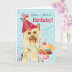 Feliz aniversário com este design bonitinho com um sorridente e festeiro Yorkshire Terrier vestindo um sorvete. O texto pode ser facilmente alterado; basta clicar no botão personalizar.