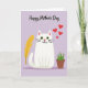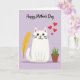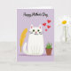 Designed with a stylized white cat as the main focus, this card shows it facing forward with big green eyes and a small, friendly smile that feels like a quiet, affectionate hello ❤️. The cat has pointed ears with soft pink inside and thin black whiskers, set against a pale lavender background that keeps everything calm and gentle. Near the cat’s upper right side, three red hearts float upward in different sizes, like a shy little trail of fondness. On the left side, a single golden feather with fine line details adds a light, companionable touch, as if someone just left it there as a sweet sign. On the right, a small green plant sits in a simple brown pot, bringing in a cozy, homey note 🌼. Across the top, a celebratory message appears in flowing black lettering, centered and easy to spot against the lavender. The illustration stays flat and smooth with minimal shading, letting the cat’s bright eyes and the red hearts stand out. The red hearts rise diagonally toward the upper right while the golden feather rests to the upper left of the cat.
