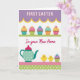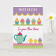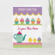 This greeting card features a tiered layout that feels like a cozy kitchen scene dressed up for a special day. At the top, large white letters sit on a lavender striped background, edged with a sunny yellow scalloped trim. Just below, five small frosted treats line up on a thin green striped band, each topped with swirls of golden yellow, bright pink, soft purple, and aqua, like they were made to share between close friends 🌷. In the middle, a short message in magenta flowing lettering sits across the design, standing out against the lighter colors. The lower section shows a teal teapot with white polka dots and a pink lid, placed beside two round little yellow chicks that lean toward one another as if keeping each other company 🐇. Underneath them, the base mixes pink diagonal stripes with a green polka-dot pattern, creating a layered, homey backdrop. The teapot’s handle curves to the left, and the two chicks sit to the right against the patterned bands.