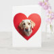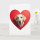 This card shows a light-colored dog’s face peeking out from the middle of a large red heart on a white background. The dog looks like a Labrador, with creamy fur, floppy ears, and a calm, curious expression. Its warm brown eyes look straight at you, with tiny light spots that make them feel bright and friendly. The nose is a soft pink, and you can see fine whiskers around the muzzle. The big heart behind the dog is a strong red that stands out clearly against the plain white space. There isn’t any text on the front, so the dog and heart are the main focus and the message stays open for your own words. It’s a sweet choice for someone who loves dogs and simple love notes 💘❤️.