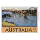 Poster de viagens vintage para a Austrália, mostrando uma ilustração do porto de Sydney.