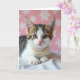 Designed with a tender, close-up portrait of a young tabby-and-white kitten, this card draws you in with a gentle, affectionate gaze ❤️. The kitten faces forward with large green-gold eyes, and its warm brown and deep black stripes frame the forehead and ears against a bright white muzzle and chest. A small strand of creamy, softly shimmering pearls rests around its neck, adding a sweet, dressy touch that feels like a quiet gift between friends. The kitten sits on a plush, tightly woven cream blanket, where the texture looks cozy enough to sink your fingers into. Behind it, a soft pastel pink background fades into blurred white floral shapes, like a calm room decorated for a special day 🌼. Your greeting text can sit centered near the top in a muted gray or soft rose, with a smaller line near the bottom in matching tones. The light is diffused and gentle, highlighting the pearl sheen and the fine fur along the kitten’s cheeks, with the pink backdrop and faint white flowers softly out of focus.
