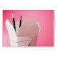 Peça ao seu amigo que o conheça por comida chinesa com esta fotografia bonito de uma caixa de saída e paus pretos com um fundo rosa brilhante.