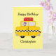 Saudação de aniversário com cartão amarelo design de táxi que você pode personalizar com qualquer texto de sua escolha. Se precisar de ajuda para personalizar, entre em contato conosco através do link desta página. Cartão de aniversário de táxi