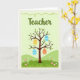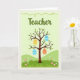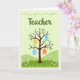 This card features a spring scene centered on a stylized tree standing in a calm, pale green landscape, with a gentle, friendly mood like a quiet thank-you shared between close friends 🌷. At the top, the word “Teacher” appears in deep green lettering, with a looping decorative line nearby that lightly frames the heading. In the middle, a rich brown trunk supports clusters of green leaves, and the branches stretch outward as if offering a welcoming embrace. Hanging from the branches are four egg-shaped decorations in soft pastel shades such as yellow, light blue, and warm orange, each patterned with dots, wavy lines, and simple geometric accents. Rolling emerald hills fill the lower portion, giving the scene a cozy, tucked-in feeling like a shared walk on a mild morning 🐇. Small blossoms in pink and white are scattered across the hills, adding tiny points of color that feel like little gestures of care. The background stays softly shaded in greens, while the tree and ornaments carry slightly deeper tones for contrast. The eggs hang at slightly different heights, and the hills curve in smooth waves beneath them.