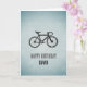 Para o ciclista, um design moderno com um efeito "metal" urbano de uma bicicleta impressa em aço galvanizado. Excelente para o comprar para homens e adolescentes com seu esquema masculino de preto e cinza. É claro que você pode adicionar qualquer nome e também pode mudar a ocasião se você quiser uma saudação diferente - apenas digite um substituto sobre o atual "aniversário feliz". Sua própria mensagem pode ser adicionada dentro, onde também há um gráfico de bicicleta menor.