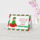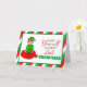 Lindo e pequeno elfo natalino desenhado à mão sentado na sacola de brinquedos do Papai Noel. Cartão de Natal festivo vermelho, verde e branco que pode ser personalizado dentro. Basta adicionar seu nome na seção personalizada.