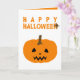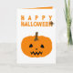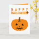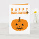 Um cartão de Dia das Bruxas dobrado com uma abóbora e um texto "Feliz Dia das Bruxas" em branco. Personalize o plano de fundo entre outras opções.
