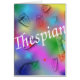" Thespian"… você sabe que o que significa… faz? Este cartão caracteriza um fundo colorido arco-íris com máscaras da comédia e da tragédia.