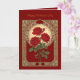 Three deep-red roses rise from a single stem. Two blooms are fully open; a third flower is partially unfurled, and a small tight bud perches above them, promising another bloom. The flowers sit against an intricate circular repeating swirling motifs.