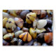 Fotografia de muitas pequenas conchas de moluscos listradas coloridas.