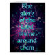 "A Glória do Senhor brilhou à sua volta" Luke 2:9 citação verso Bíblia com tipografia de arte abstrato em estrela azul, preta, laranja, roxa e rosa criada com acrílicas. Ilustração cristã religiosa criada pela artista Catherine Sweetman usando tintas acrílicas.
