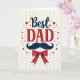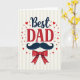 Este cartão centra-se numa mensagem carinhosa de “Melhor PAI”, com “Melhor” colocado no topo em letras azul-marinho profundas e “PAI” logo abaixo em letras vermelhas fortes com pequenos traços finais. As palavras parecem inclinar-se uma para a outra, como um abraço caloroso entre pai e filho 👨. Sob o texto, há um bigode de guidão azul-escuro com pontas bem enroladas, dando ao design um visual amigável e elegante. Logo abaixo, uma gravata borboleta vermelha brilhante com pequenos pontos brancos adiciona um toque alegre, como alguém pronto para um dia especial 👔. O fundo é preenchido com listras verticais suaves que alternam entre creme pálido e bege claro, adicionando uma textura suave sem dominar. Pequenos corações vermelhos e minúsculos pontos vermelhos estão espalhados ao redor do centro, como se estivessem flutuando para cima em afeto silencioso. A mensagem principal permanece no meio do cartão, com os corações e pontos cercando-a para guiar os olhos de volta às palavras. Na área inferior, a gravata bor