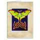 Uma traça lunar, com ela é partes finais que entram em um jogo celta intrincado dos nós e no céu nocturno que sparkling atrás dele