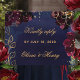 Um convite de casamento de marinho arrojado que apresenta uma sinfonia de peões vermelhos bordéus profundos adornados com spray de ouro e contornos de ouro em ximersão se reúnem em volta de um fundo de lavagem de cor azul-d-água marinho com seus nomes grandes em um roteiro rústico de ouro com uma fonte não serif maiúscula anunciando seus detalhes.