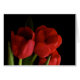 Este cartão de nota lindo caracteriza um buquê do escarlate das tulipas vermelhas e as folhas do verde ajustadas em um fundo preto puro.