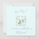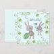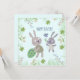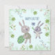 Paaskaart met illustratie van twee paashaasjes met ei en bloem, en rand van gras en bloemen. Tekst voorkant 'happy easter!' (kan aangepast worden). tekst achterkant 'fijne Pasen'' en 'een mooie vakantie en tot gauw!' (kan aangepast worden).