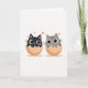 This greeting card shows two stylized kittens peeking out from cracked eggshells on a soft white background, with a gentle, friendly closeness between them 🐰. The left kitten is a deep charcoal color with wide dark eyes, a small sweet smile, and ears lightly tinted pink. Beside it, a light gray tabby with fine stripes and rosy cheeks looks calmly outward, as if sharing a quiet moment with its companion. Thin whiskers curl from both faces, adding a simple, lifelike touch without making the scene feel busy. Small red hearts float above and between their heads, suggesting affection and an easy bond 🐇. Any greeting text would sit near the top in a light gray tone, leaving plenty of open space around the illustration, while a short sign-off could be placed along the bottom in soft pink. The eggshell halves are shaded in warm tan and brown with jagged edges, framing each kitten like a little nest.