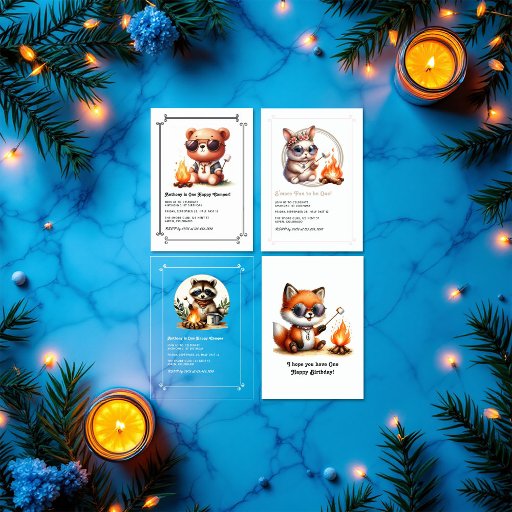 Mande desejos calorosos da fogueira com este adorável cartão de aniversário de animais da floresta! Com na moda de pequenos campistas assando marshmallows pelo fogo, este cartão é perfeito para uma celebração de primeiro aniversario mural ou temático de acampamento. Personalizado, brincalhão e cheio de encanto confortável!