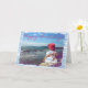 Um cartão de boas-vindas com uma menina de chapéu vermelho e de vestido cor-de-rosa e a praia (Pwllheli, North Wales). Pode ser utilizado em várias ocasiões (o texto é personalizável).