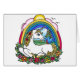 Um unicórnio cumprimenta o pássaro azul da felicidade sobre o arco-íris em uma terra brilhante de paz e abundância.