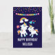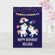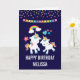 Um cartão de aniversário com 2 unicórnios dançantes fofos com caudas e crinas brilhantes e coloridas. Um arco-íris colorido com nuvens de cada lado acima de suas cabeças. Outros elementos incluem uma pequena flor, um coração e algumas estrelas. Fundo roxo escuro. Pontos de confete coloridos e uma imagem de uma bandeira de festa ao longo da parte superior.