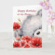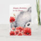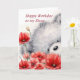 Urso cinza bonito segurando um monte de flores vermelhas para a irmã, Feliz aniversário, minha irmã.