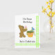 Um design bonitinho com um doce urso de pelúcia segurando um cone de sorvete rosa. Um plantador de jardins e um pássaro azul sentado na vinha. Personalize a mensagem conforme desejado.