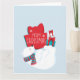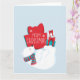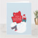 O cartão Feriado Whimsical apresenta um cachecol vestindo presentes polares fazendo malabarismo nos pés. Gráficos lacrimogêneos, vermelhos e brancos sobre fundo azul-claro dão-lhe uma sensação retrógrada.