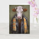 Esta design apresenta um retrato de uma vaca em uma jaqueta de couro e um cachecol.