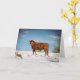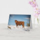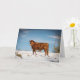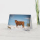 Touro marrom num campo coberto de neve contra um belo cartão azul de saudação