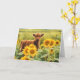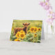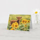 Feliz Solstício de Verão! Um bezerro giro num campo de girassóis com borboletas. Uma saudação de solstício alegre!