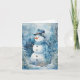 Homem de neve adorável com chapéu azul e cachecol em uma floresta aproveitando este frio dia de inverno.