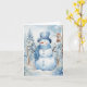Homem de neve adorável de chapéu azul e cachecol rodeado por bonito flores brancas, árvores cobertas de neve e uma casinha de pássaros neste frio dia de inverno.
