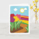 As tulipas florescem ao sol num dia brilhante de primavera. Vibrantes florações de cores estão em filas onduladas à distância. Lá em cima, no céu azul claro, estão duas nuvens inchadas e o sol amarelo-limão. Use para amizade, Páscoa, aniversário, jardineiro. Imagem digital do papel pintado à mão. Azul, vermelho, rosa, amarelo, marrom, roxo, branco. Dentro: Vazio