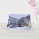 Um cartão vazio com uma foto na parte dianteira de uma lagoa norueguesa com um boathouse no primeiro plano e uma igreja através da água.