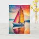 Um veleiro colorido em água calma com um belo pôr do sol no fundo.