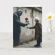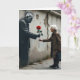 Uma idosa estende a mão em direção a um mural de um homem que oferece uma rosa vermelha vívida em uma parede de meteoros