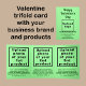 Feliz dia do Namorados! Um feriado adorável para comemorar este fevereiro e anunciar também seu negócio ou promover seu nome de marca. Cartão triplo personalizável, verde claro, com saudação de Namorados, seu nome comercial, produtos ou serviços e outras informações de sua empresa. Cartão triplo como brochura para a sua empresa. Você pode colocar até três produtos ou serviços. Personalize-o e dê-o aos seus clientes ou clientes para cumprimentá-los neste feriado de Namorados e como material de marketing para anunciar a sua empresa e promover os seus produtos ou serviços. Para personalizar esta placa tripartida, carregue o logotipo da sua empresa e as imagens dos seus produtos ou serviços. Digite também seu nome de empresa, endereço, número de telefone, e-mail, site ou página de mídia social de sua empresa e uma breve descrição atraente de seus produtos ou serviços. Verifique a aparência em todos os lados depois de carregar imagens e digitar textos. Se a aparência lhe agrada, você pode colocar seu pedido agora. Se você precisar redimensionar e mover as imagens e os textos para o ajustado nesta placa tripartida, troque a ferramenta design. Você também pode alterar a cor do plano de fundo, a cor da fonte e o estilo da fonte na ferramenta design. Anuncie sua empresa. Promova o nome da sua marca. Cartão triplo personalizável que você pode usar para criar reconhecimento de nome de marca. Feliz dia do Namorados! Desejo mais vendas para você neste feriado.