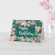 Um fundo verde escuro dispara as flores rosa ilustradas e marrom com folhas brancas e verdes. Cartão perfeito para uma senhora especial de qualquer idade!