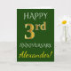 Este simples e personalizado design de cartão de felicitações de aniversário de casamento apresenta a mensagem "FELIZ 3º ANIVERSÁRIO", com o "3º" tendo uma aparência semelhante a ouro. A frente também apresenta um nome personalizado e um fundo verde. O interior apresenta uma mensagem personalizada de felicitações de aniversário de casamento. Pode ser dado a um marido ou uma esposa em celebração do terceiro aniversário de casamento do casal. [~Z0000086]