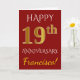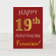 Este simples e personalizado design de cartão de aniversário de casamento apresenta a mensagem "FELIZ 19º ANIVERSÁRIO", com o "19º" tendo uma aparência semelhante ao ouro falso. A frente também apresenta um nome personalizado e um fundo de cor vermelha. O interior apresenta uma mensagem de aniversário de casamento personalizável. Pode ser dado a um marido ou esposa em celebração do décimo nono aniversário de casamento do casal. [~Z0000078]